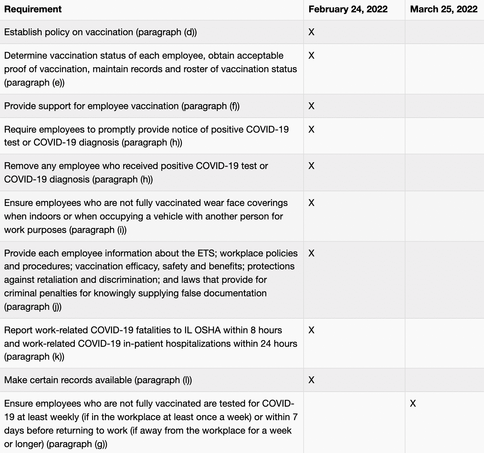 While the rules were effective immediately, Illinois employers with more than 100 employees have until January 24, 2022, to begin complying with the requirements of the OSHA ETS, which include developing workplace policies and procedures regarding vaccination and testing.