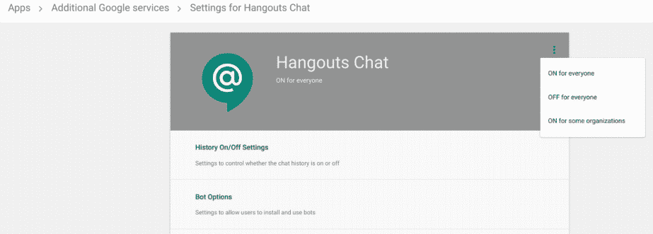 “Hangouts Chat provides several options for Admins to control sharing PHI. Hangouts Chat can be enabled or disabled for everyone in the domain or selectively enabled for specific organizations. To enable the service for specific organizations, Admins can select the ‘ON for some organizations’ option which displays the Org Units to search and select. Note that cross domain and external communication is not supported in Hangouts Chat.”